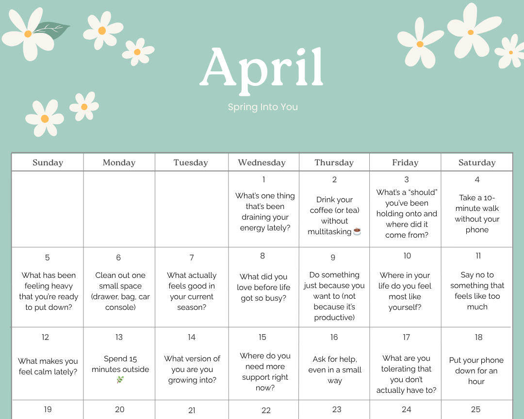 April inside Messy but Managed is all about coming back to you. Spring Into You is a month of simple prompts and small resets designed to help you clear the noise, reconnect with yourself, and move through your days with a little more intention—without adding more to your plate.